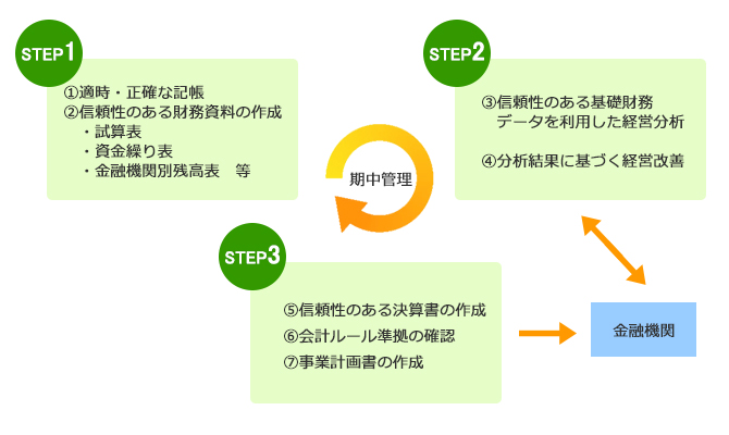 経営の根幹として財務経営力や資金調達力はとても大切です。当税理士事務所では下記のステップで、会社経営力を強化してまいります!